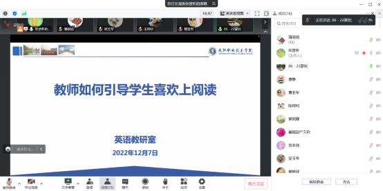 12月7日下午,英语教研室组织专职教师召开专题教研活动,开展“教师如何引导员工喜欢上阅读”专题教研活动,会议采取线上腾讯会议形式举行。会上,英语教研室教师蒙钦、曹亚军、陈阿利等老师分享了如何引导员工喜欢上阅读的相关经验,其他老师进行了探讨。