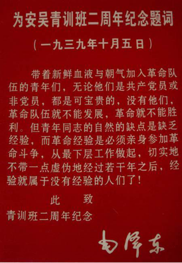 毛泽东主席亲笔题词勉励青训班学员积极参加革命斗争实践,在实践中锻炼才能,积累经验。