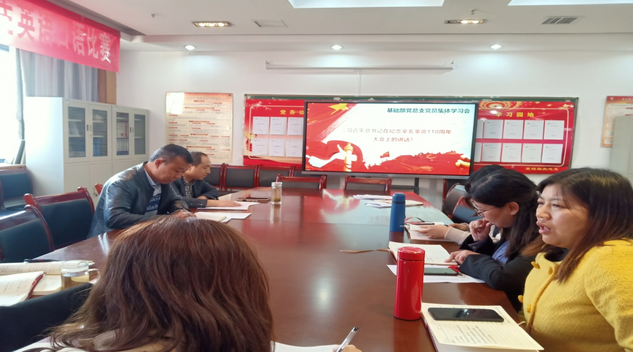 10月21日下午,基础部党总支召开集体学习会议,党总支书记宁海成主持会议,全体党员参加。会议学习了《习近平总书记在纪念辛亥革命110周年大会上的讲话》、《用好红色资源、赓续红色血脉,总书记5点要求要牢记》。