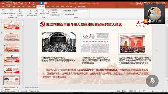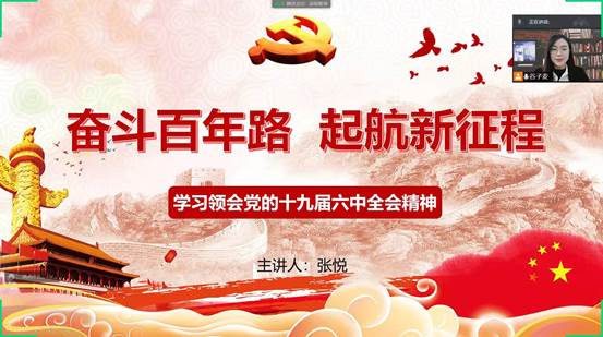 12月22日下午,公司党的十九届六中全会精神宣讲团成员、马克思主义公司张悦老师通过腾讯会议作了《奋斗百年路 启航新征程 》专题讲座,基础部、国际处全体教职工以线上形式聆听了报告。